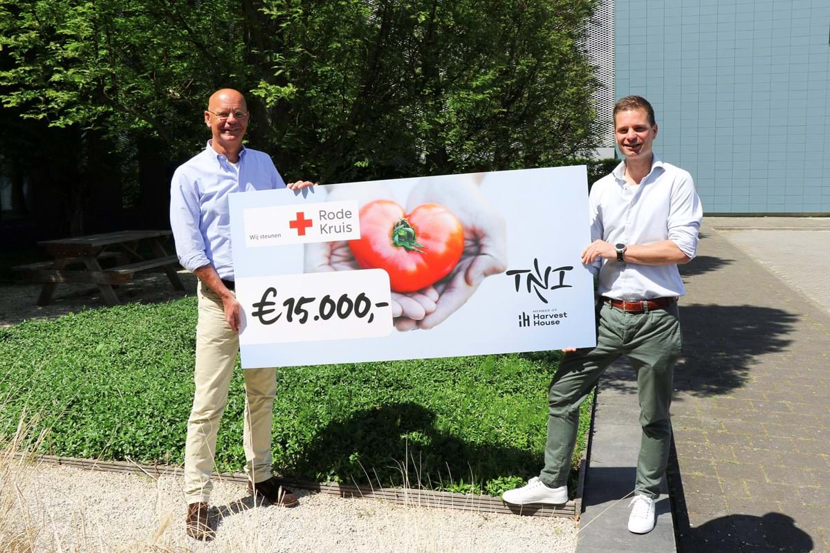 Dankzij onze actie 'Snacken voor elkaar' hebben we een bedrag van € 15.000,- kunnen doneren aan Rode Kruis Nederland. Onze retailpartners en de telers van Harvest House reageerden enthousiast op het idee om tomaten-actieverpakkingen op de markt te brengen. Van elke verkochte verpakking was € 0,20 bestemd voor het Rode Kruis. Nu de actie afgelopen is, heeft dit een totale donatie van € 15.000,- opgeleverd. Dat hebben we middels een speciale cheque van 1,5 meter aan het Rode Kruis overhandigd. Zij gaan het geld gebruiken in de strijd tegen corona om de meest kwetsbaren te helpen en zorgpersoneel te ondersteunen.